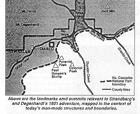 Strandberg tells us how daunting the terrain could be....It took nine hours the next day to get down Ladder Creek to Newhalem, a distance of about four miles. We followed one-and-a-half miles of deer trail, which proved to be the easiest route down the cliffs into Ladder Creek. From then on it was a brush fight. The creek being too high to follow or cross, we had to take to the brush and timber. We finally came upon a trail, which runs for about three-quarters of a mile up the creek on the left bank... From Newhalem, they took the train to Diablo to recover their baggage, then returned to Newhalem to approach Mt. Terror from Goodell Creek. Again, the undeveloped backcountry was rough going. ...We found, however, that the trail if the last two miles could be called that, ended in the creek bottom at 1,600 feet elevation. After a night on a gravel bar in Goodell Creek, and doing justice to an even dozen good-sized trout caught from a pool nearby, we started upward with our packs along a creek, which, our map indicated, flowed from the right ó or east ó side of Pinnacle Peak. This is a different mountain from the Pinnacle Peak on the Colonial Peak massif to the south. We had to travel by compass and good luck, for clouds were hanging on the mountaintops, hiding all landmarks. We arrived at timberline at 7 p.m., after climbing 4,400 feet in two miles, through woods and brush. Adverse weather kept them from climbing the next day. Still, they continued their exploration of their fog-bound surroundings. ...(W)e spent an hour building a cairn and another hour exploring the ridges by throwing rocks and listening for their fall. By this method we could roughly determine the direction of the ridges, the width of the top and whether there were cliffs or heather slopes on the sides... Stymied another day by the weather, they wound up their trip by heading for Diablo via Sourdough Mountain. On the way, they were able to add one last summit, the peak now known as Mt. Degenhardt. Strandbergís description of the journey home reminds us of the ruggedness of this land before roads and hiking trails penetrated the wilderness. ...This region is most rugged and inaccessible. Long broken ridges run in all directions, offering many varied and interesting rock climbs. On the McMillan Creek side there are several hanging glaciers, almost a thousand feet directly below, and I do not believe I was ever so impressed with the ruggedness of the mountains as when I looked down on their crevassed surfaces, especially since we had planned on crossing this ridge on what we supposed to be an easy route to Sourdough. At 5 p.m., we turned back down Crescent Creek, thence up to a notch just west of the peak we climbed. The other side of the ridge appeared to offer a route to the glacier south of Terror, so we started down. We negotiated the first 100 feet before dark and spent three hours on the remaining 200 feet by flashlight. We carried heavy packs, the rock face was steep and treacherous, and the ledges and footholds filled with loose scree. We therefore roped in about thirty-five feet apart and proceeded cautiously. Only one of us moved at a time, while the other belayed the rope around rocks or by means of body belay. We found that with each of us alternately taking the lead, we could save considerable time in the handling of the rope. It then became necessary only to alter the position of the rope on the belay and pay it out, the man at the belay remaining in position with the rope coiled just as when he hauled it in. We finally made the glacier after crossing a bergschrund where it was bridged with fallen rock. A quarter moon rose, furnishing some light, and we worked our way down the glacier, around crevasses, and over snow bridges, which were by that time frozen solid. At 2:30 a.m., our way was blocked by another cliff, so we decided to catch a couple hours of sleep. After considerable searching we found a flat slab and a crack which would accommodate our sleeping bags. Thus we ended a most interesting vacation, on which we made nine ascents. There was no evidence of previous ascent on any except Jack Mountain.